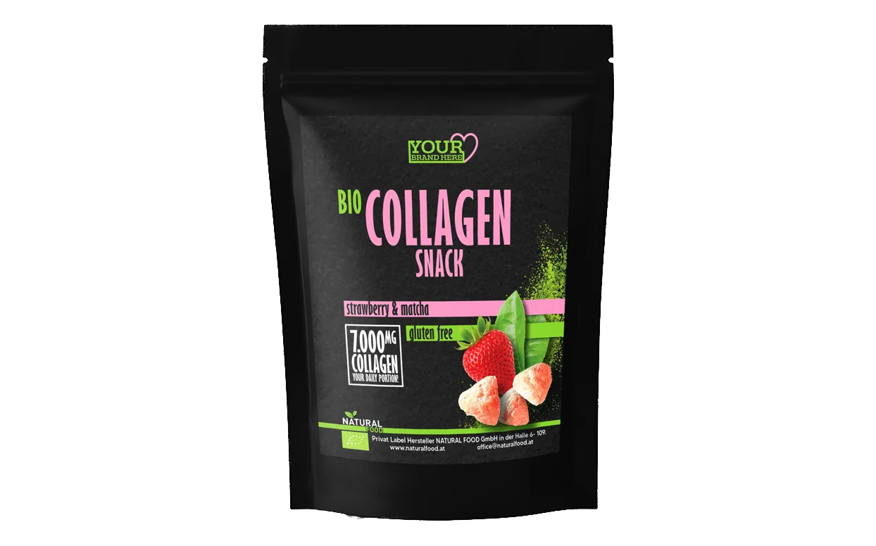 Unsere Bio Collagen Snack mit 7.000 MG Collagen je Portion ist einzigartig auf dem Mark. Es gibt Collagen Drinks und Riegel, aber keine Collagen Knabbersnack. Damit beginnt eine neue Ära in der Funktionalfood Bereich.